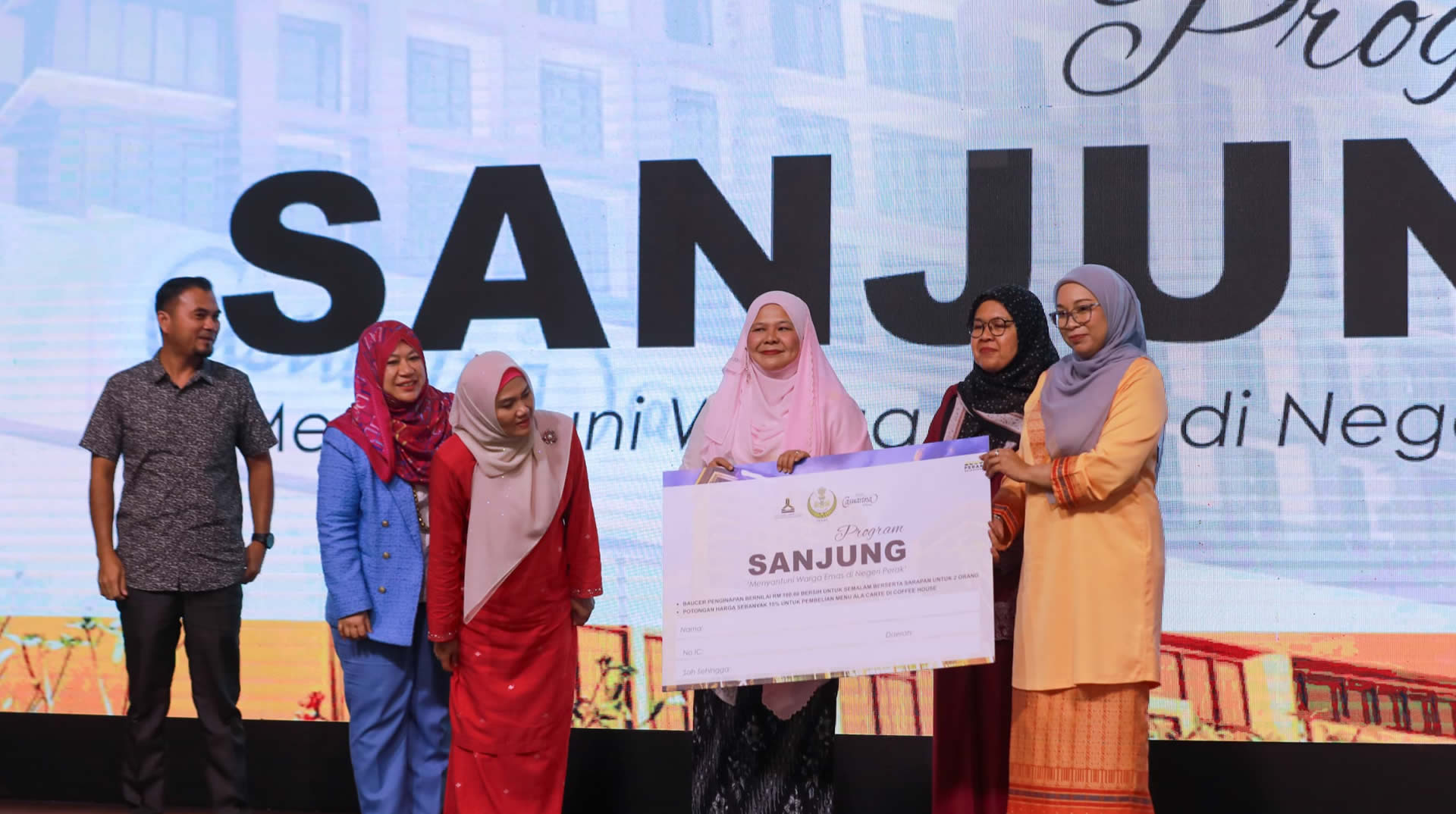 YB Dato' Salbiah binti Mohamed, Pengerusi Jawatankuasa Pembangunan Wanita, Keluarga, Kebajikan Masyarakat, Pembangunan Usahawan dan Koperasi Negeri Perak berkata, "Program Sanjung ini adalah manifestasi komitmen kerajaan negeri dalam meraikan warga emas di Negeri Perak. Inisiatif yang diketengahkan ini adalah bermatlamat memupuk semangat kasih sayang antara generasi, yang menggalakkan anak-anak meluangkan masa berkualiti bersama ibu bapa mereka. Warga emas Perak kini berpeluang menikmati percutian yang lebih istimewa dan mesra bajet melalui Program Sanjung Perak Sejahtera 2030 di Hotel Casuarina@Meru. Kerajaan Negeri amat prihatin kepada warga emas Negeri Perak supaya mereka tidak ketinggalan dalam menikmati percutian bersama keluarga dan rakan-rakan di lokasi percutian yang selesa, selamat dan mesra OKU (Orang Kurang Upaya)."